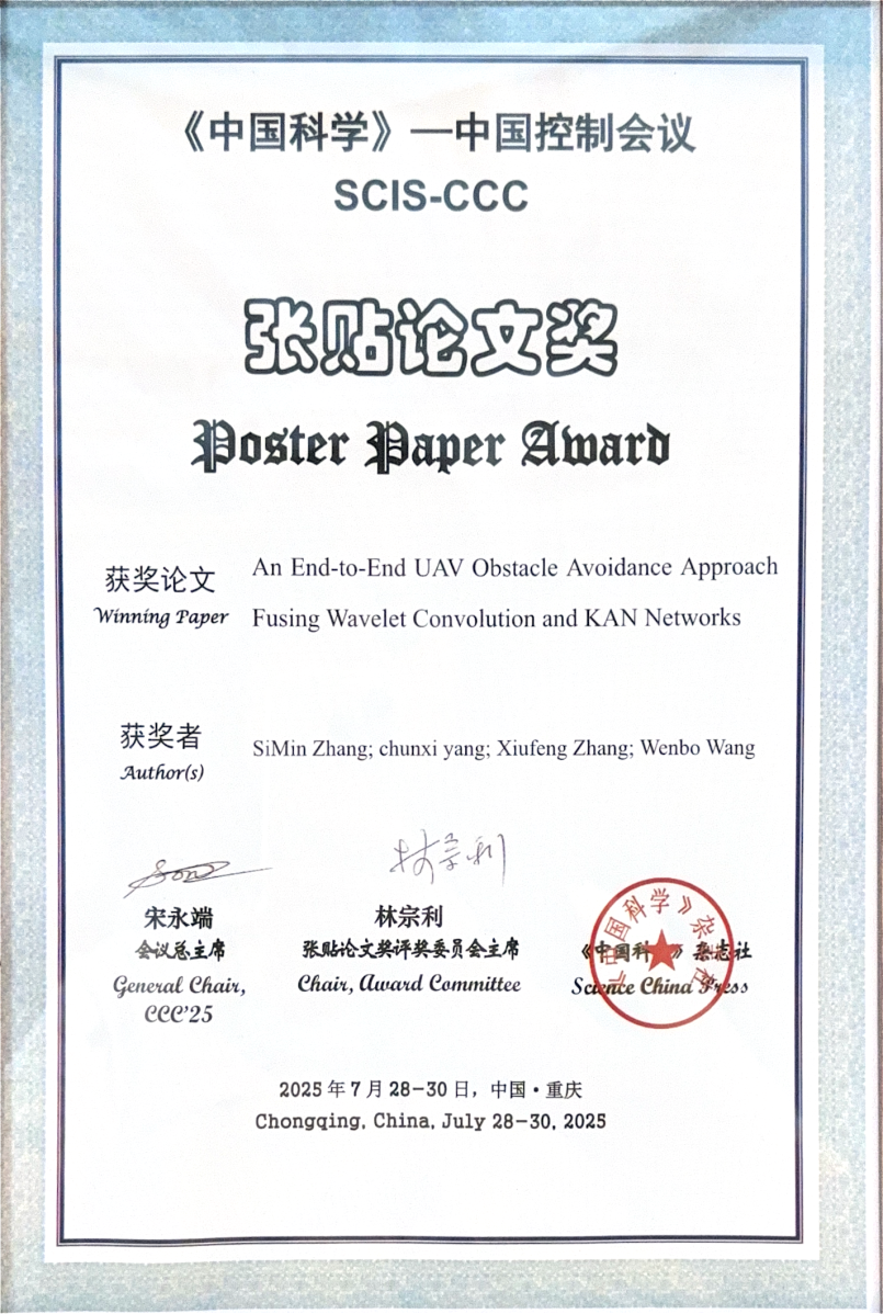 [C23] Simin Zhang*, Chunxi Yang, Xiufeng Zhang and Wenbo Wang, “An End-to-End UAV Obstacle Avoidance Approach Fusing Wavelet Convolution and KAN Networks,” 2025 44th Chinese Control Conference (CCC 2025), Chongqing, China, 2025, pp. 4828-4833, doi: 10.23919/CCC64809.2025.11178342 (Poster Paper Award) [Poster].
